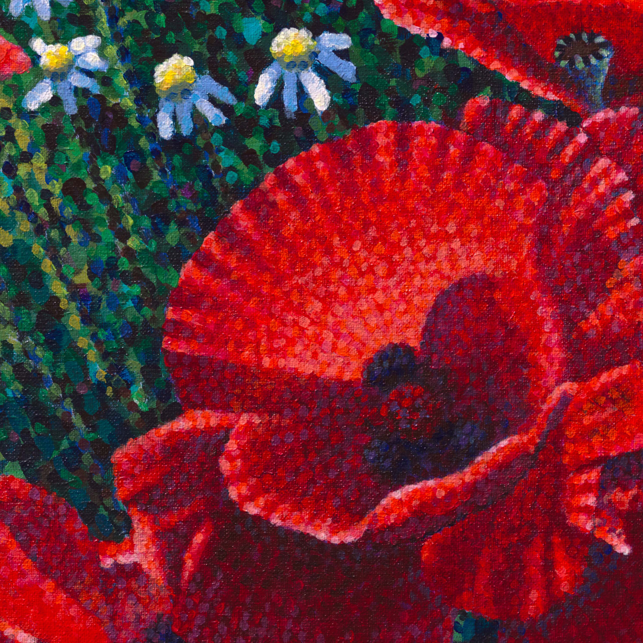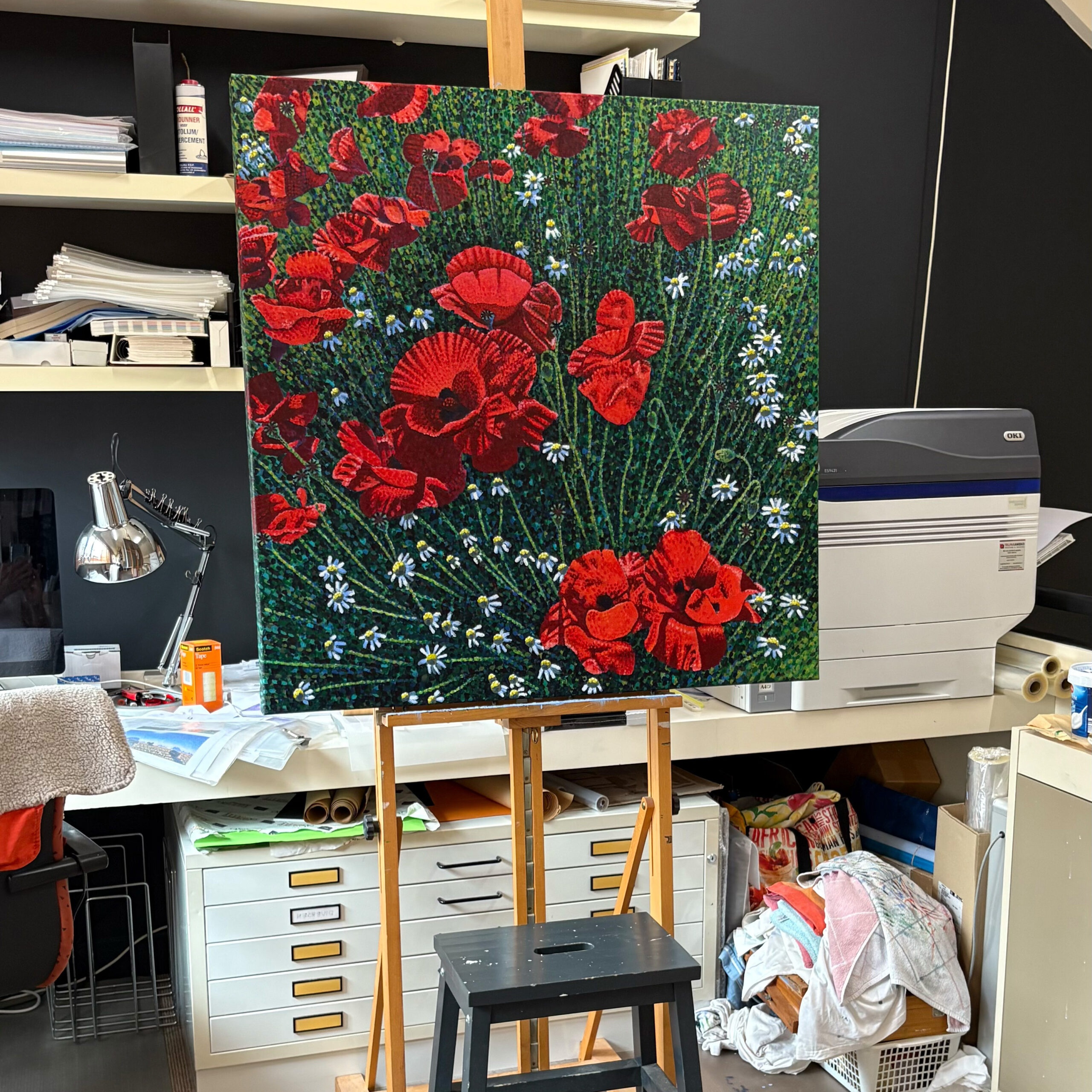 You take a walk through the polder and are surprised by bright red poppies among the green grass and daisies on the verge. Scenes like this from the surrounding countryside are the inspiration for many of my paintings. Such scenes catch my eye because of certain aspects, such as in this case the colour contrast between the red of the poppies, the white/yellow of the daisies and the fresh green of the grasses.
